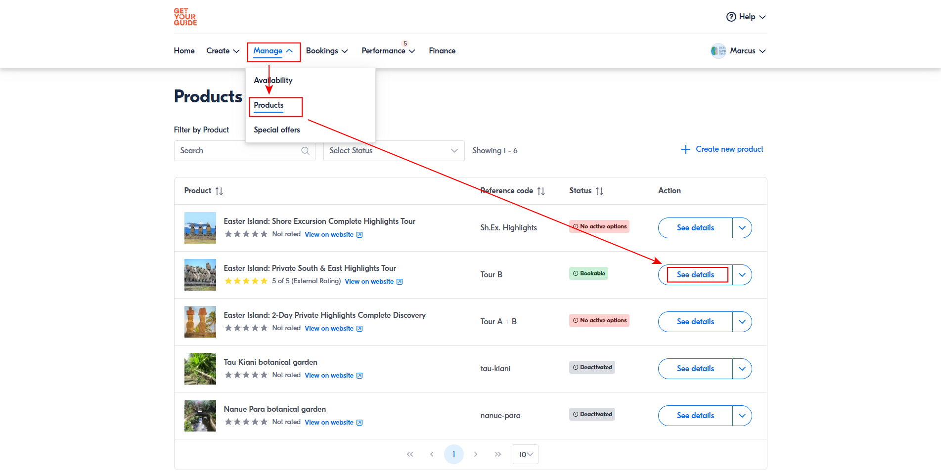 Go to Manage > Products and click See details on the activity you want to connect to TourTask.