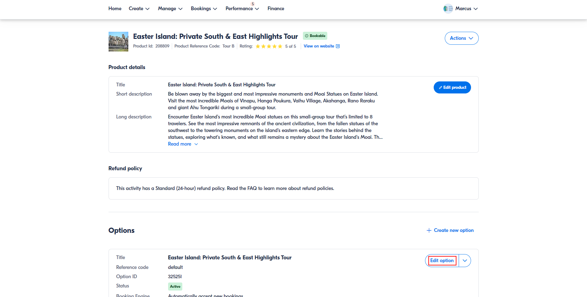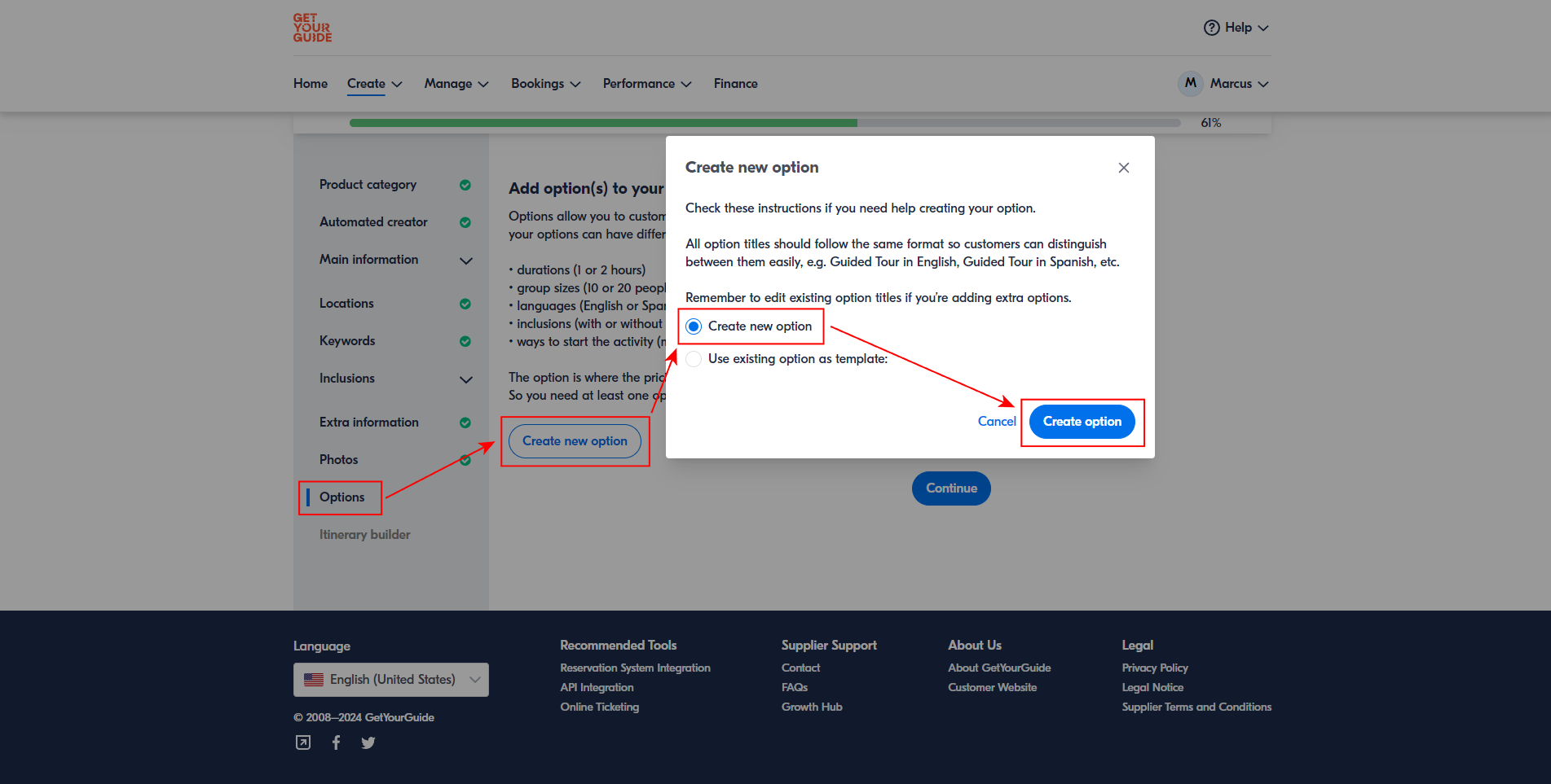 Fill out your product information on the next page. Once you reach the "Options" section, create a new option. GetYourGuide requires at least one option for each product. Start with creating the default option. If your activity has optional add-ons in TourTask that you want to offer on GetYourGuide, you can create these activity variations as additional options.