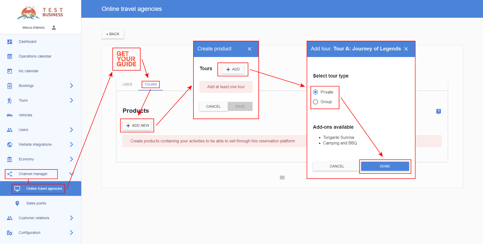 If you haven't activated GetYourGuide in your TourTask panel yet, then you can do this by going to Channel Manager > Online travel agencies > GetYourGuide and clicking Start integrating.