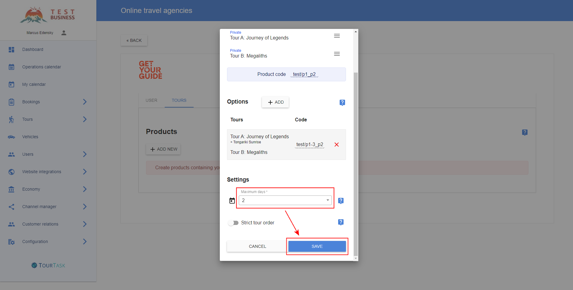 If you want to create a multi-activity product, you can repeat the process of clicking the Add button at the top of the dialog and add more activities to the same product. If you do this, you will have to select a Maximum days amount. This is the maximum duration that this product will be allowed to have in order to be considered available. This is particularly useful if you have some shorter tours that can be performed on the same day. Please note that it may also result in your client having a free day in between. TourTask will always select the combination of available tours with least total duration from first to last tour, but if necessary, the full amount of maximum days will be used.