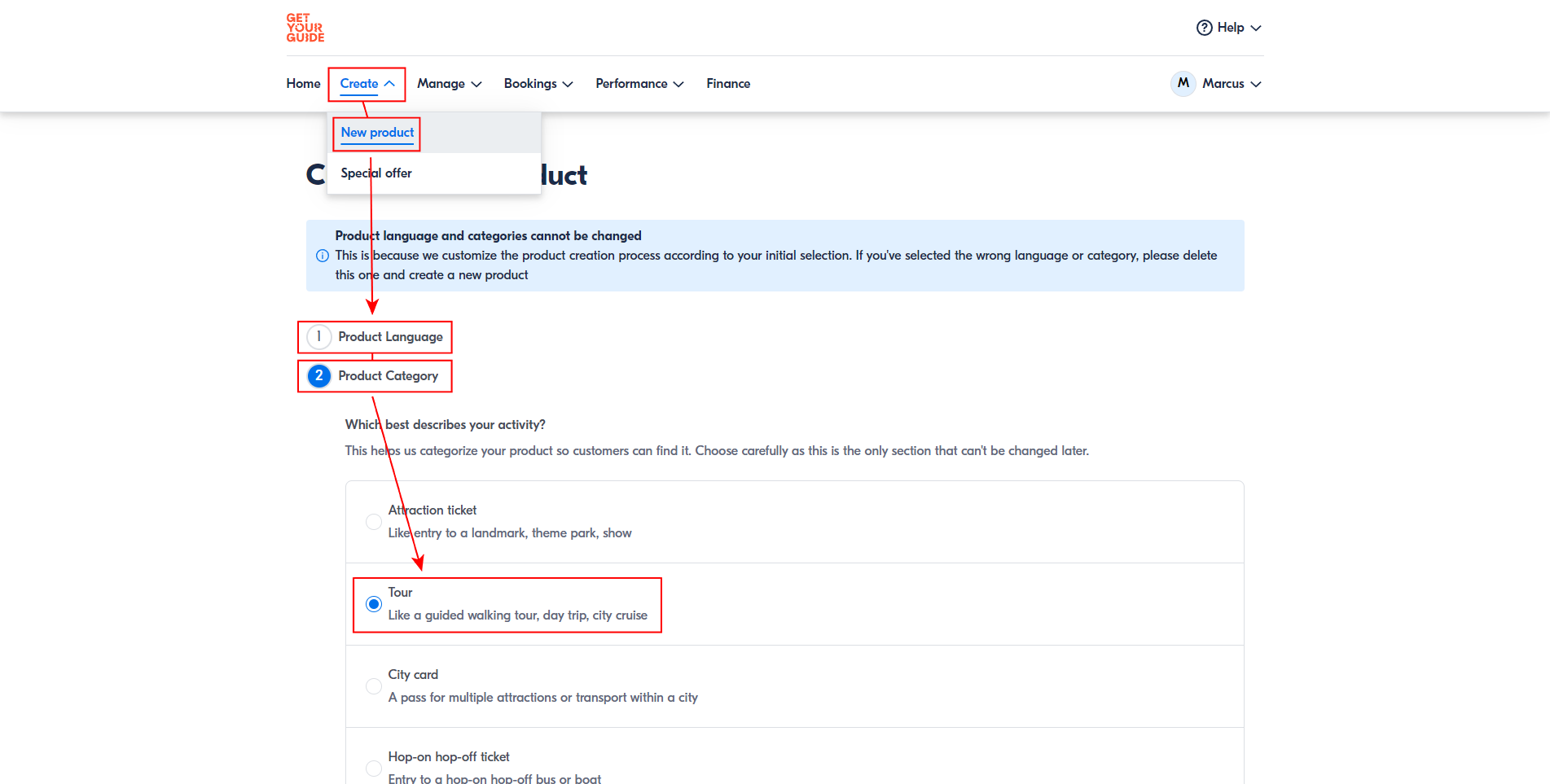 Make sure you're logged in at supplier.getyourguide.com and then go to Create > New Product. Select your title and description language, and then select your product category. Since you're using TourTask, most probably your product category will be Tour, or possibly also Transfer.