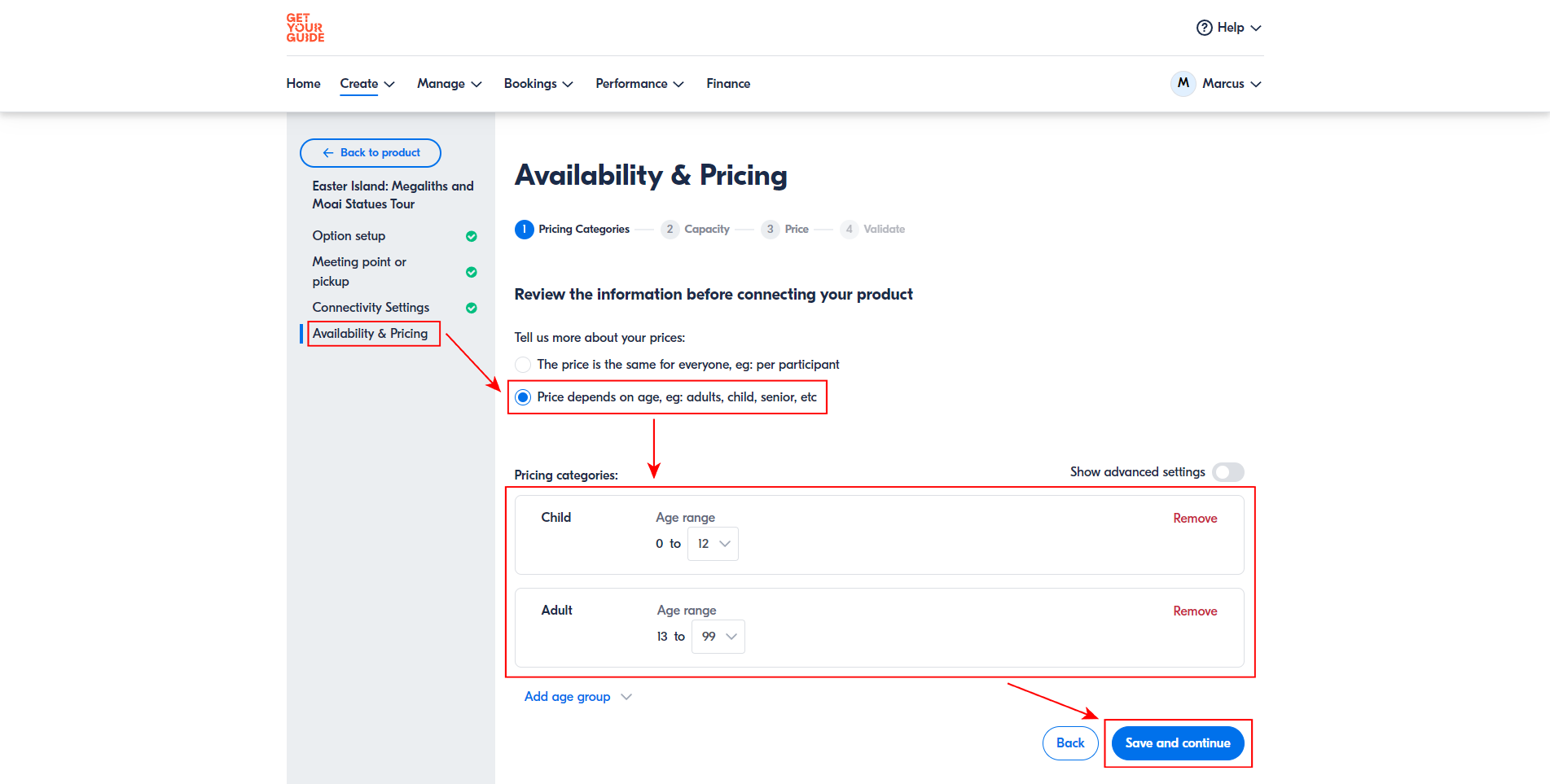 Under Availability & Pricing select Price per person and click Add new pricing. Please note that if you want to charge all customers the same, simply don't activate any other price groups than adult. This step is important to make the connection work.