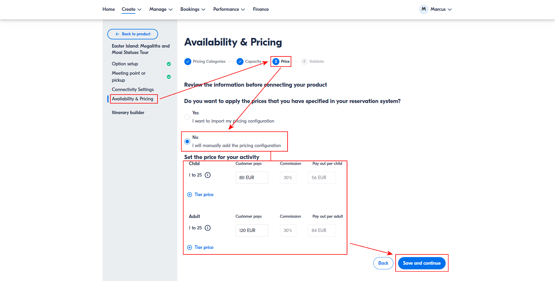 Under Availability & Pricing > Price > Do you want to apply the prices that you have specified in your reservation system? select No. If you are creating a product that contains a private tour, then typically you'd want to add scaled pricing by clicking Tier price. You can then specify the price per person for each passenger amount. If your product only contains group tours and you're not using scaled pricing, then just add the price per person and click Save and continue. Please note the commission that GetYourGuide charges. Make sure you specify a price that is high enough to cover this commission. You can use the form below to calculate the price you need to charge in order to receive a specific amount.Amount customer pays: {{priceCalc.amtToReceive / (1 - priceCalc.commissionPercentage / 100) | number:2}}We have chosen to not support sending pricing information from TourTask to GetYourGuide, since GetYourGuide only support flat rate pricing when using this feature, which would complicate things if it's a private tour, in which case you would typically want to use scaled pricing.