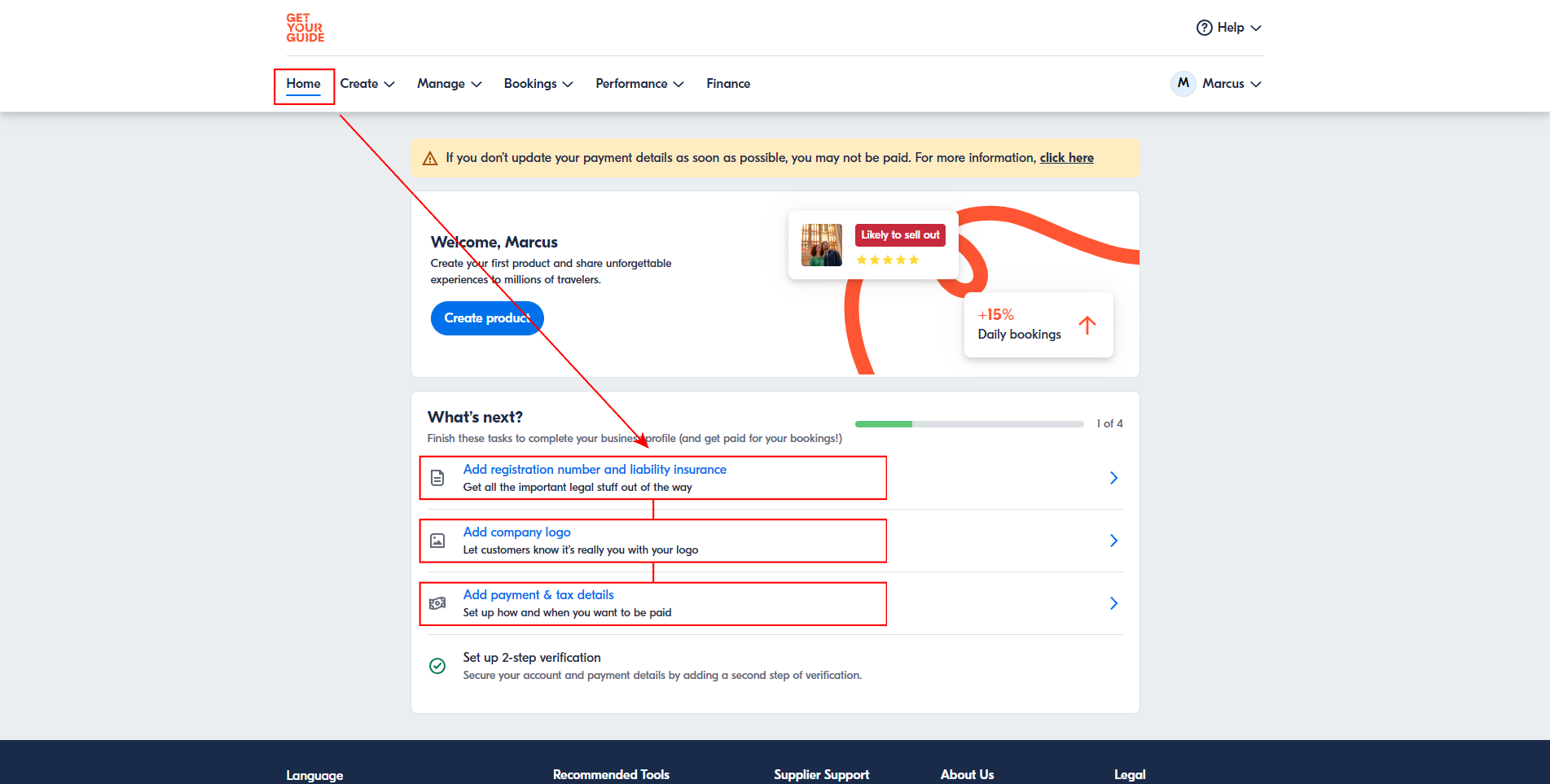 - Finish the registration process and log in to your new GetYourGuide supplier account.