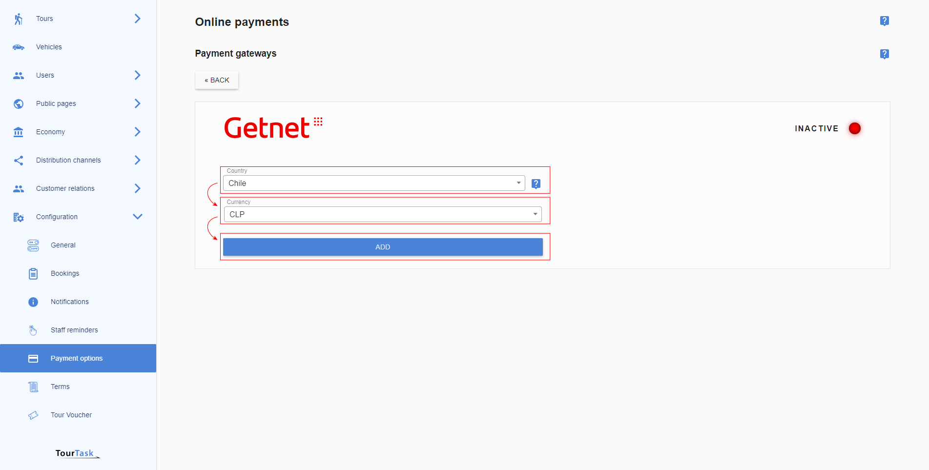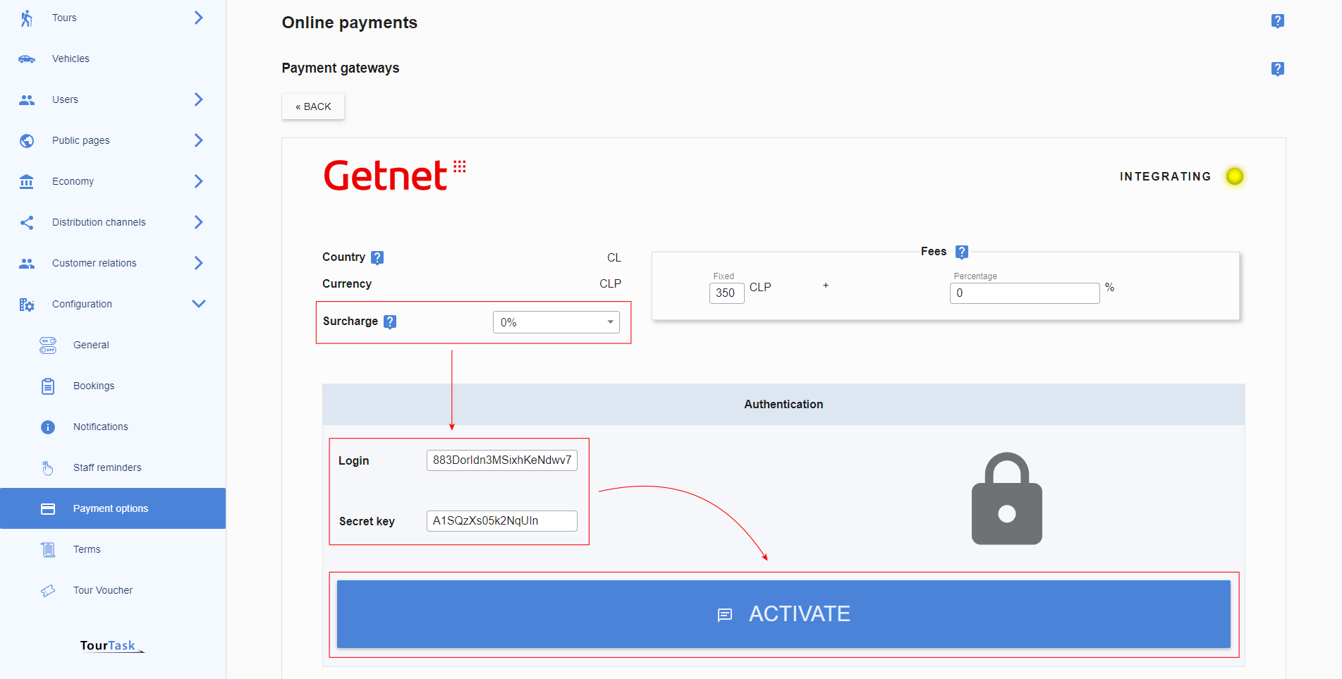 These credentials must be entered in TourTask to activate this payment gateway. To achieve this, follow these steps: