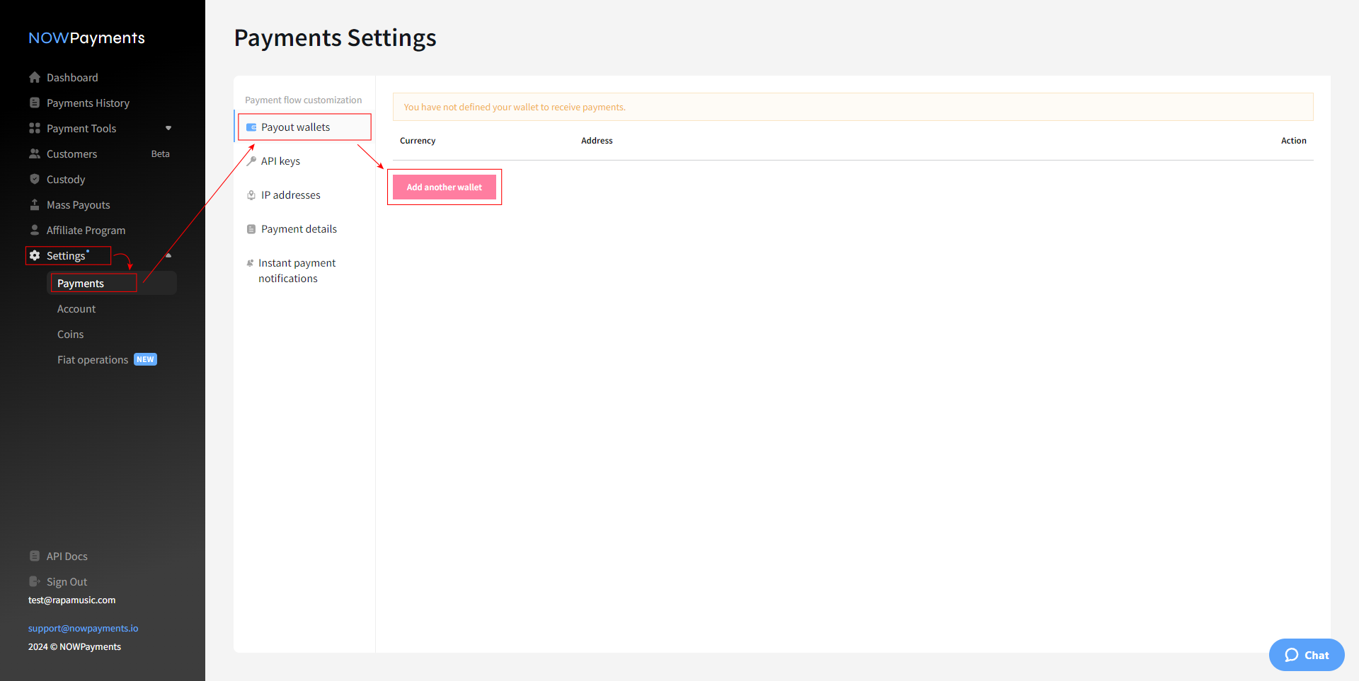 If you did not register your wallet when creating your account, you must do so now instead for the API key to be generated. To do this, go to Settings > Payments > Payout wallet, click Add another wallet, enter your wallet address and save.