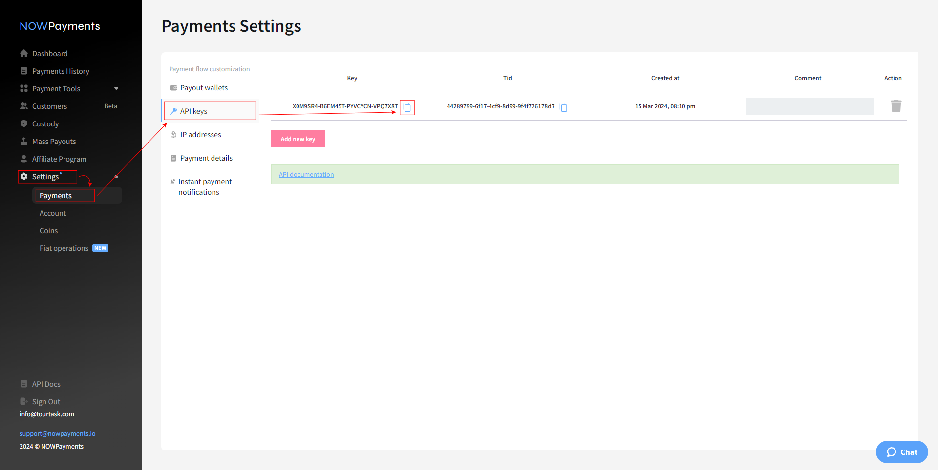 Once your wallet is registered, your API key will appear in Settings > Payments > API keys. Click the copy icon button under Key to copy it to the clipboard for later pasting it into the TourTask configuration.