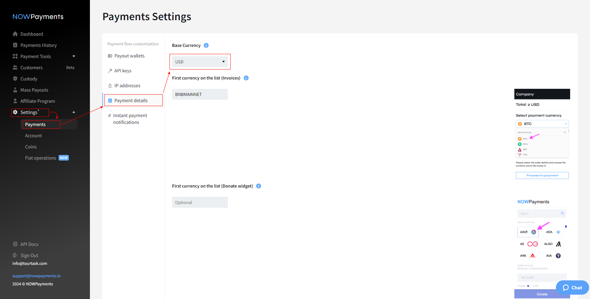 In Settings > Payments > Payment details, under Base Currency, select the currency you want the price to be displayed in. You must also select this as your currency for NOWPayments when you add this payment method in TourTask.