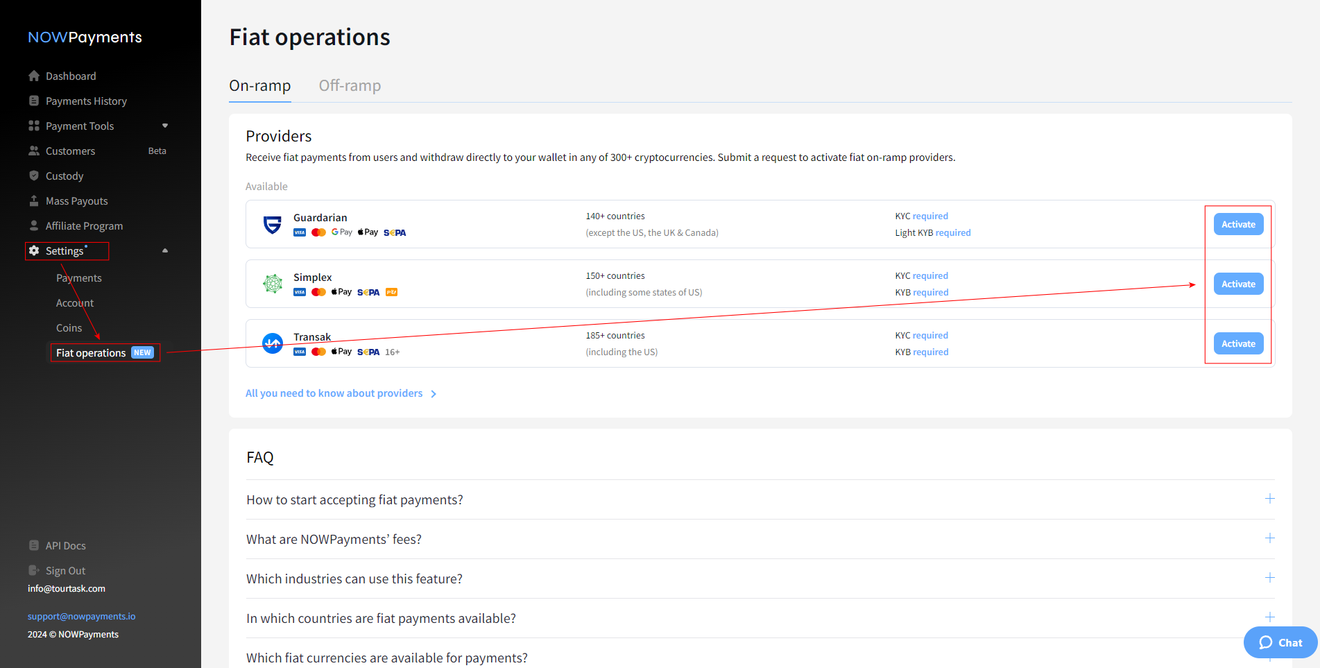 It's recommended to apply for being able to accept fiat payments, which lets your customers pay with common cards such as VISA and MasterCard. These payments will instantly be converted to the cryptocurrency of your account. To do this, log into your NOWPayments account and go to Settings > Fiat operations. Select one of the available options and go through the application process. If you don't get an answer within a week, please contact the NOWPayments support.